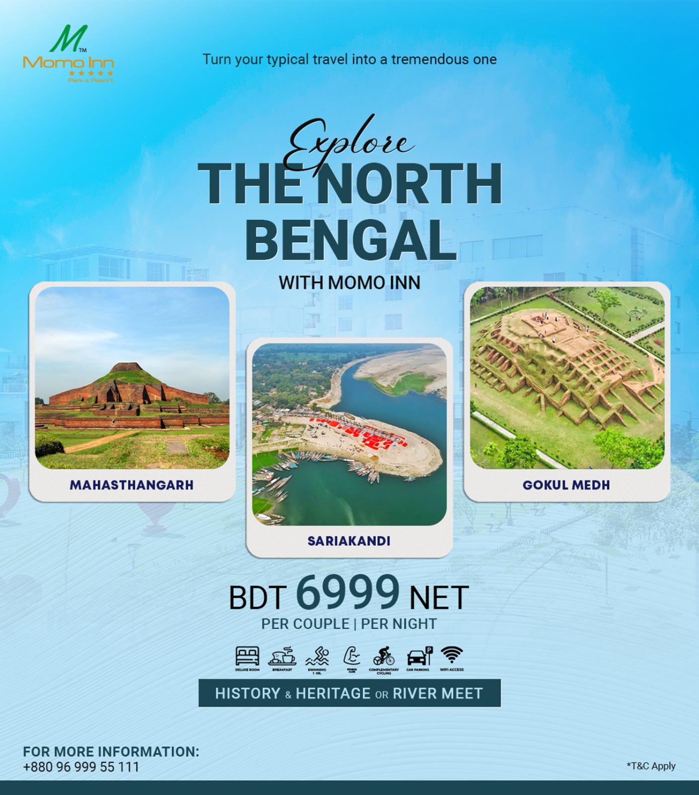 Discover the magic of North Bengal with Momo Inn. Explore ancient history & heritage at Mahasthangarh and Gokul Medh, or embrace the serene beauty of the river meet at Sariakandi. An unforgettable escape awaits! Price: BDT 6999 Net Per Couple | Per Night 📞 For reservations or more information: +880 96 999 55 111 *Terms & Conditions Apply