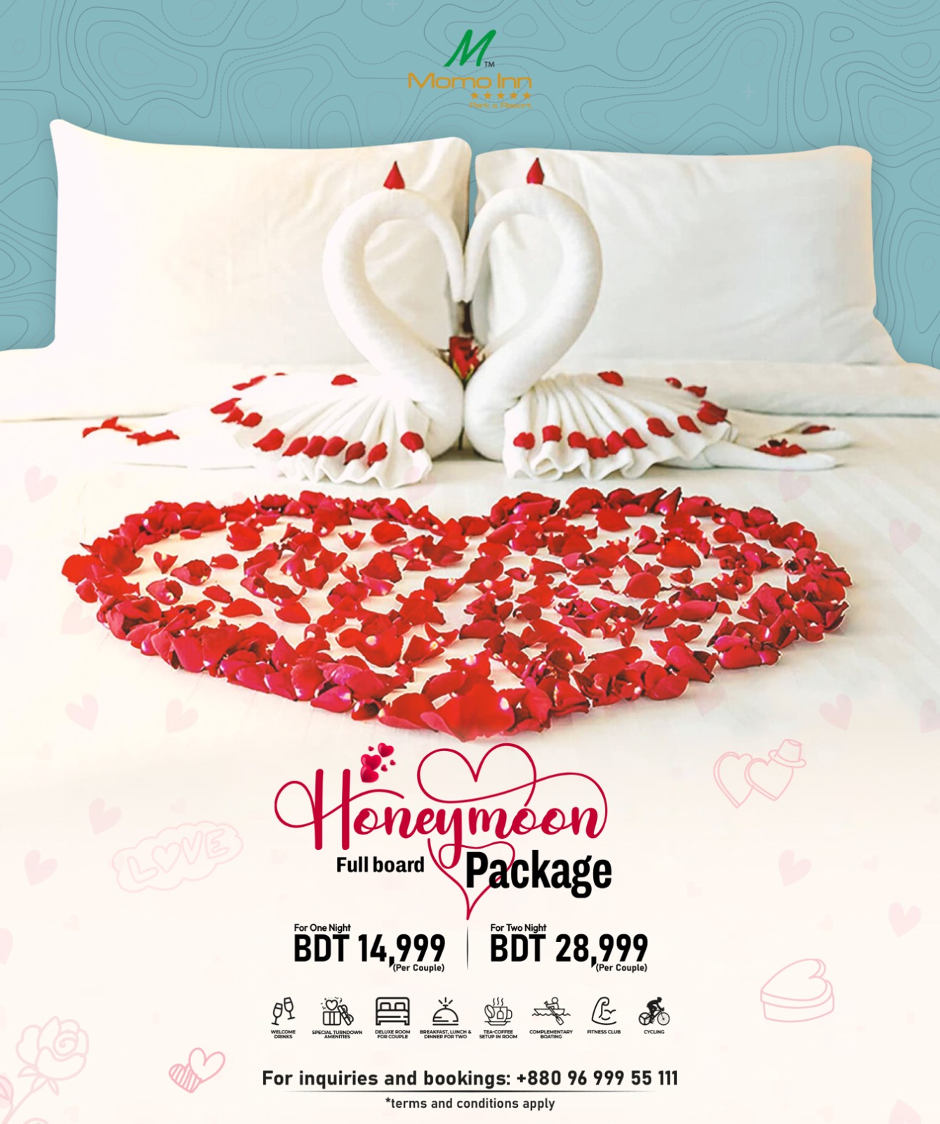 Begin a lifetime of togetherness at Momo Inn Park & Resort—where romance meets tranquility. Our customized honeymoon packages offer the perfect balance of relaxation and adventure. Honeymoon Full Board Packages: * One Night: BDT 14,999 (per couple) * Two Nights: BDT 28,999 (per couple) Offer Includes: * Welcome Drinks * Special Turndown Amenities * Deluxe Room for Couple * Breakfast, Lunch & Dinner for Two * Tea-Coffee Setup in Room * Complementary Boating * Fitness Club * Cycling 📞 For bookings or more information: +880 96 999 55 111 Terms & Conditions Apply